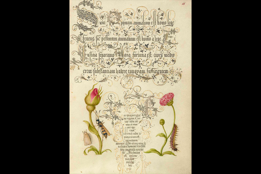 네덜란드 정물화가 발전하기 전, 화가들은 손으로 쓴 원고에 채색을 하여 작품에 감정적 힘을 더했습니다. 이러한 화풍을 펼친 유명한 화가로는 요리스 회프나겔이 있습니다. 이 그림은 게오르그 복스카이가 16세기 중반에 그린 원고인 미라 칼리그라피아에 모뉴멘타(Mira calligraphiae monumenta) 에 그가 채색한 페이지를 재현한 것입니다.