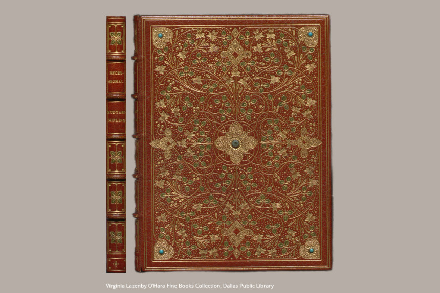 1897년 빅토리아 여왕의 즉위 60주년을 기념하여 러디어드 키플링이 쓴 시 "Recessional"을 수록하기 위해 1922년에 제작된 이 아름다운 제본은 현재 댈러스 공공 도서관 소장품에 속합니다. 터키석, 아쿠아마린, 루비 등의 보석으로 장식된 진한 붉은색 가죽 제본에 중세풍의 조명이 더해진 이 책은 그야말로 보석과도 같습니다.