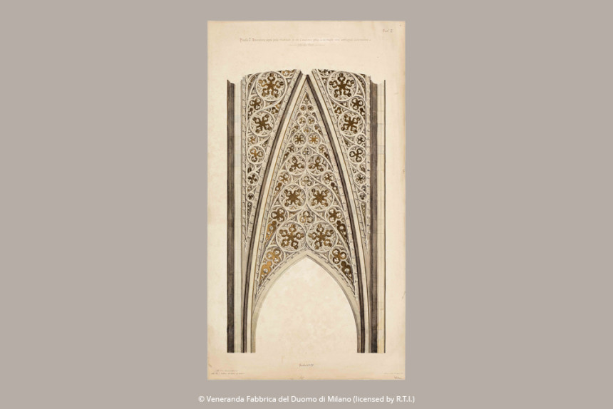밀라노 대성당은 이탈리아 고딕 건축의 정점을 상징합니다. 여기에 재현된 그림은 건축가 파올로 체사 비앙키가 대성당 내부 아치 장식을 위해 제안한 시리즈의 일부입니다. 높이 솟은 아라베스크는 금빛 배경 위로 마치 부조처럼 수목이 우거진 듯한 느낌을 자아냅니다.
