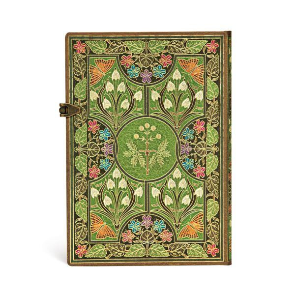 책 표지의 앞부분을 모방하는 대부분의 디자인과는 달리, 이 Poetry in Bloom 디자인은 원본의 앞면 "더블루어(doublure)", 즉 표지판 안쪽을 재현했습니다. 마모로부터 보호되는 이 부분은 제본가들에게 창의력을 마음껏 발휘할 수 있는 추가적인 공간을 제공합니다. 런던에 본사를 둔 제본 전문 업체인 리비에르 앤 선(Riviere and Son)의 제본가들은 가죽과 금박을 사용하여 꽃, 잎, 나비를 자연스럽게 표현했습니다. 만지거나 흔들면 잎을 접는 반사 작용에서 이름을 따온 이 예민한 식물은 셸리의 시에서처럼 이 디자인 구성의 핵심입니다.