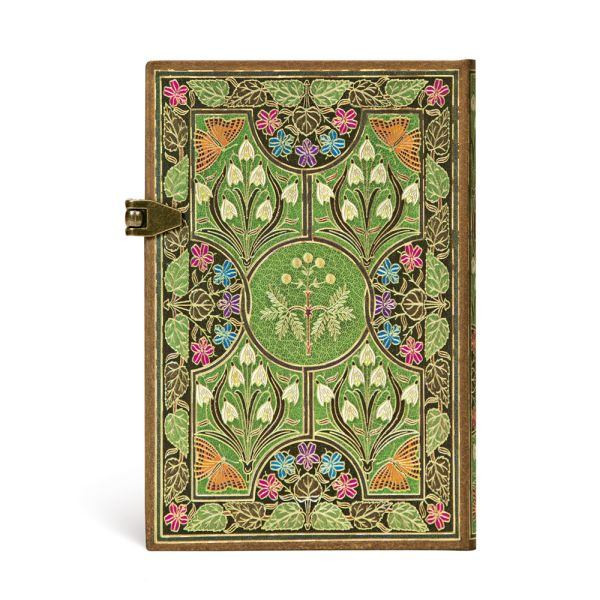 책 표지의 앞부분을 모방하는 대부분의 디자인과는 달리, 이 Poetry in Bloom 디자인은 원본의 앞면 "더블루어(doublure)", 즉 표지판 안쪽을 재현했습니다. 마모로부터 보호되는 이 부분은 제본가들에게 창의력을 마음껏 발휘할 수 있는 추가적인 공간을 제공합니다. 런던에 본사를 둔 제본 전문 업체인 리비에르 앤 선(Riviere and Son)의 제본가들은 가죽과 금박을 사용하여 꽃, 잎, 나비를 자연스럽게 표현했습니다. 만지거나 흔들면 잎을 접는 반사 작용에서 이름을 따온 이 예민한 식물은 셸리의 시에서처럼 이 디자인 구성의 핵심입니다.